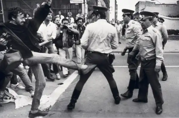 Фотограф из Западного Берлина во время демонстрации даёт пинка полицейскому, который находится по другую сторону границы в Восточном Берлине, 13 августа 1986 года. Берлин