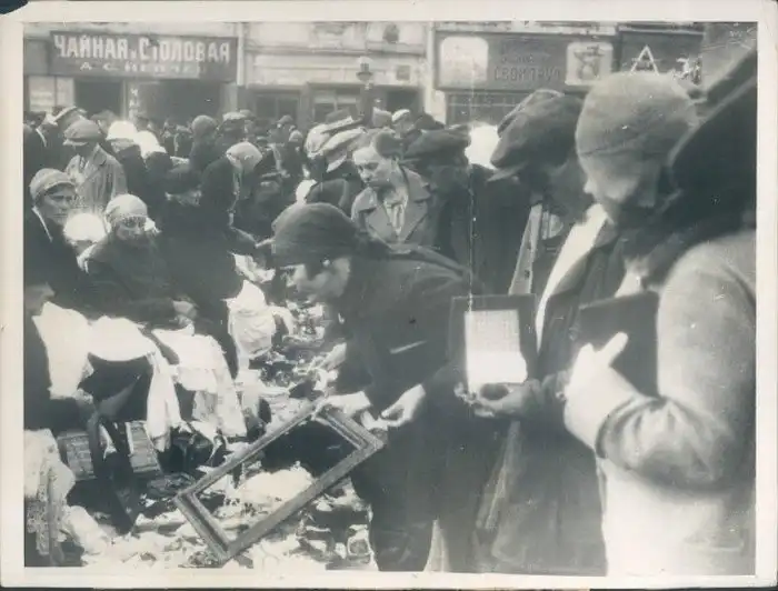 Женщина на московском рынке продает свои фамильные драгоценности. 1920-е.