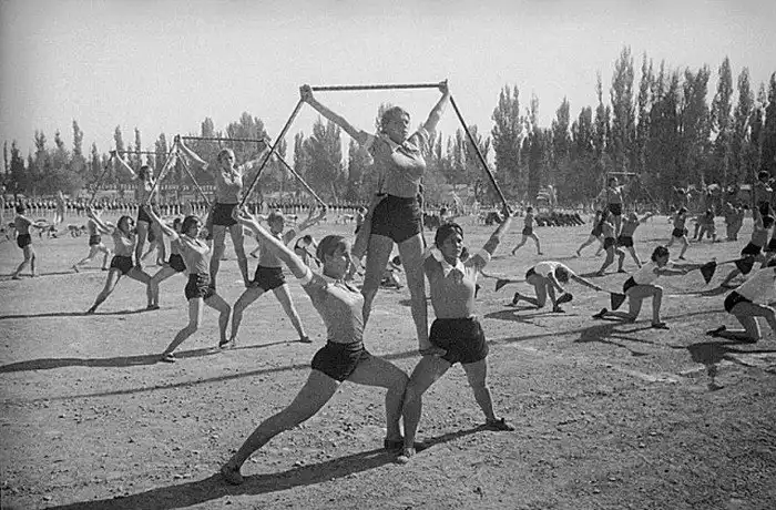 Девушки-гимнастки из физкультурного резерва во время показательных выступлений. Снимок Макса Захаровича Пенсона, фотокорреспондента газеты «Советский Восток», 1930-е годы.
