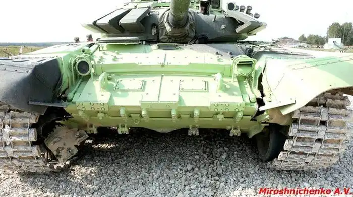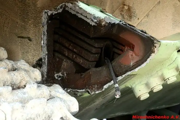 Это фото сделано во время соревнований по танковому биатлону, проходивших в рамках первых в истории Международных Армейских играх. Основной российский танк Т-72Б3 «Буревестник» во время преодоления рва ударился о его стенку. Удар оказался настолько сильным, что часть корпуса просто оборвало по сварочным швам, оголив наполнитель ВЛД.