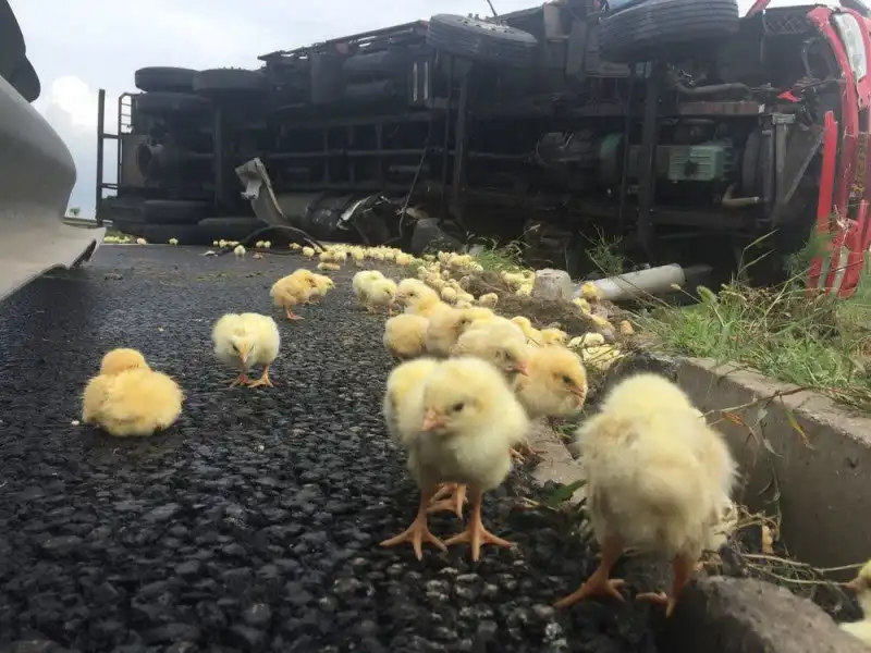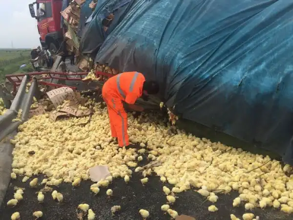 На одной из дорог восточной провинции Китая – Шаньдун – произошло довольно нетипичное ДТП. Грузовик, перевозивший более 10 тысяч цыплят, опрокинулся, после чего птенцы оказались прямо на проезжей части.
