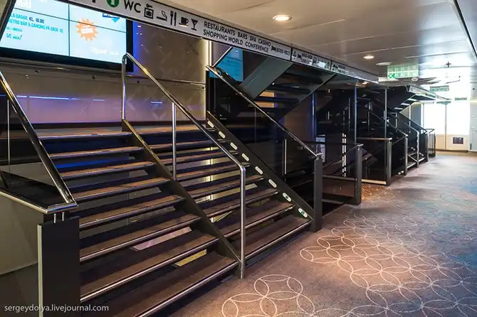 Лестницы на носу и на корме разных цветов, чтобы сразу можно было понять, где вы находитесь. Акустика помещений выполнена таким образом, что глушит все звуки, поэтому на борту довольно тихо: