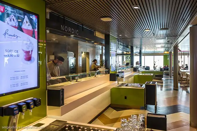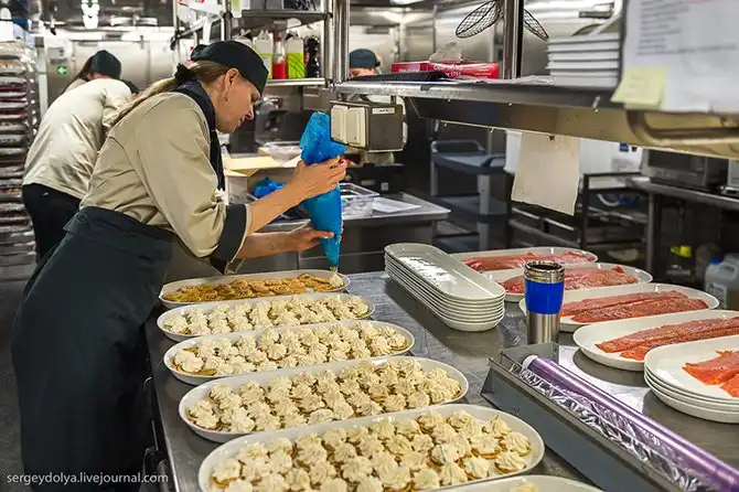 На корабле работают порядка 200 человек в две смены. Больше всего сотрудников работает в ресторанах и обслуживании. Меняются через неделю или 10 дней. Рабочий день – 10,5 часов в день. У команды есть своя сауна, спортзал, кинотеатр и другие развлечения: