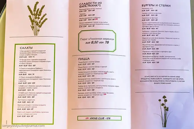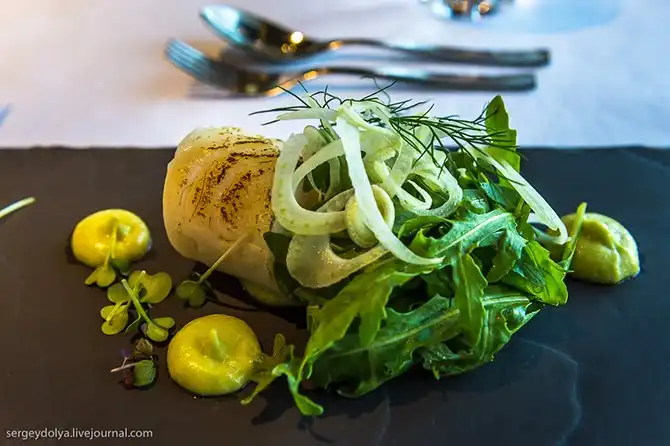 Я взял меню «Оскар» за 39 евро. В него входит поджаренное филе трески, горячее и десерт. На выбор либо копченый лосось с органическим ризотто и лисички с сыром простенс с Аландских островов, либо говяжье филе а ля Провансаль с чесночным маслом и жареным картофелем. То же самое, но с алкоголем стоит 57 евро: