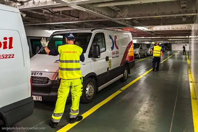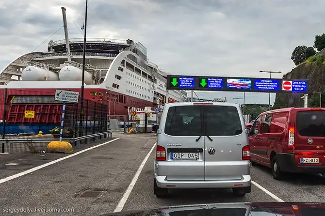 Заезд на паром в Стокгольме. Встаешь в очередь из машин, отдаешь сотруднику ваучер и получаешь ключи от каюты: