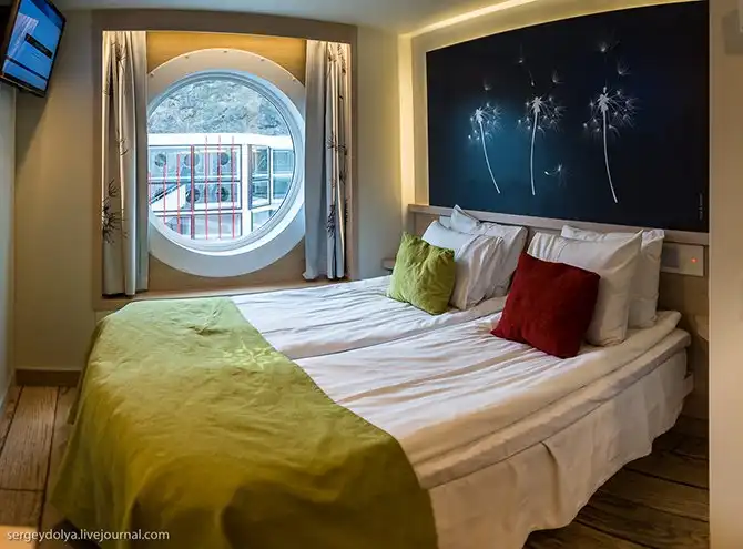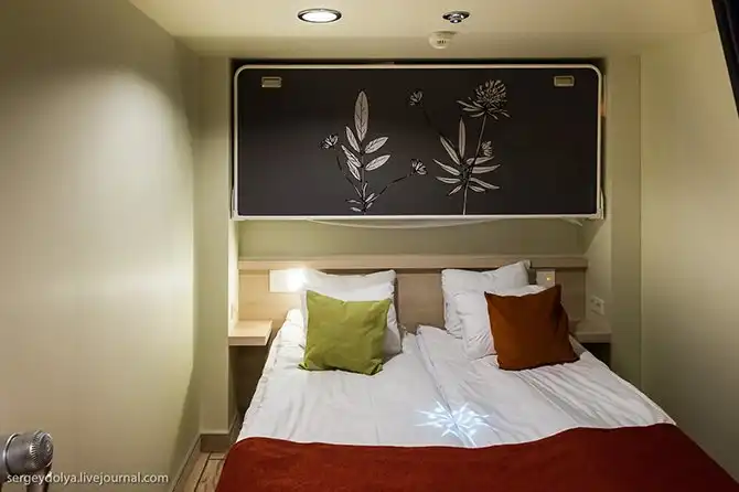 Всего на корабле 880 кают, в которых находится 2980 кроватей (плюс 201 каюта для экипажа). На верхних этажах рестораны. Каюты расположены ниже, но все они находятся над водой: