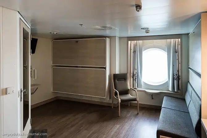 Каюта для инвалидов, таких 12 штук на борту. Стоит столько же, как и такая же обычная, но по размерам она гораздо больше. Онлайн её не заказать, только по телефону через центр бронирования:
