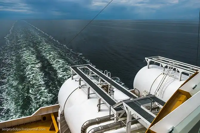 Двигатели парома работают на сжиженном природном газе. Замороженный до минус 200 градусов, газ находится в двух больших цистернах в задней части корабля. От него почти нет вредных выбросов в атмосферу, а по цене газ как дизель. Топливо не взрывоопасно – чуть-чуть дизеля-таки добавляют, чтобы искра подожгла его и двигатели запустились.