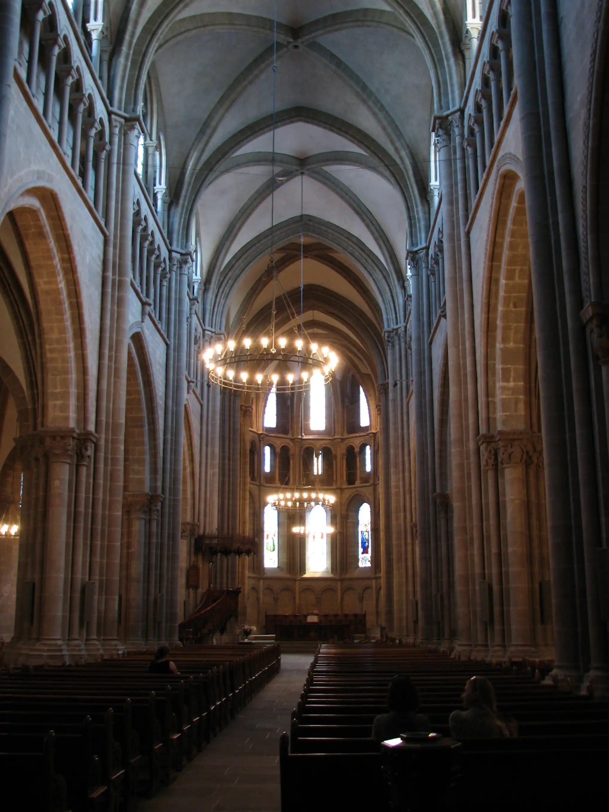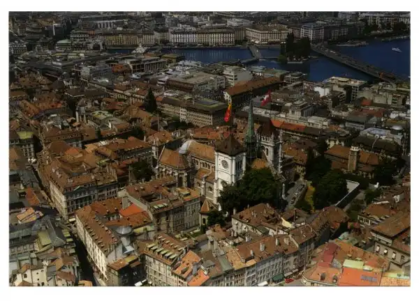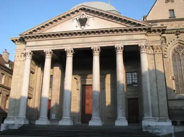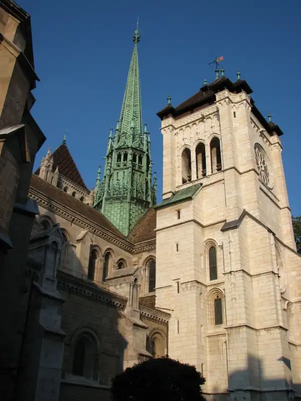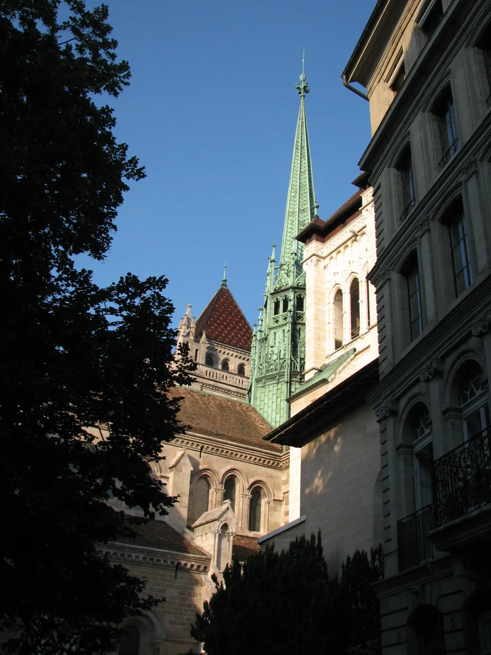 Самый большой и просторный собор Женевы – собор Святого Петра – сочетающий в себе элементы разных стилей, строился на протяжении 70 лет, с 1160 по 1230 гг. Он задумывался в готическом стиле, но включает и ряд раннероманских элементов, а также не сочетающийся с ним главный вход-портал в неоклассическом стиле, который был пристроен в XVIII веке. В 1536 г. он стал протестантским и утратил большую часть богатых украшений, типичных для католических церквей. Эта “чистка” не коснулась только скамей-сидений и витражей на алтаре. Таким образом, получилось, что внутренние помещения собора совершенно лишены украшений и ужасно строги.