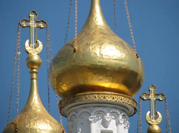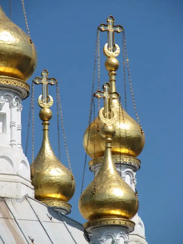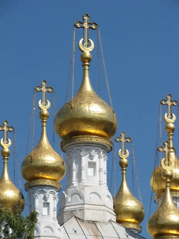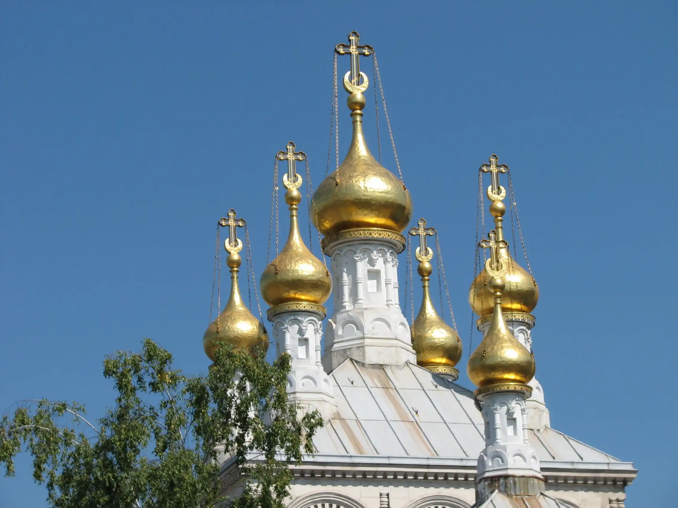 Снова православная церковь с золотыми луковками постройки конца XIX века – явный пример эклектики-стилизации под русские церкви XV-XVI веков со входом в нео-византийском стиле.