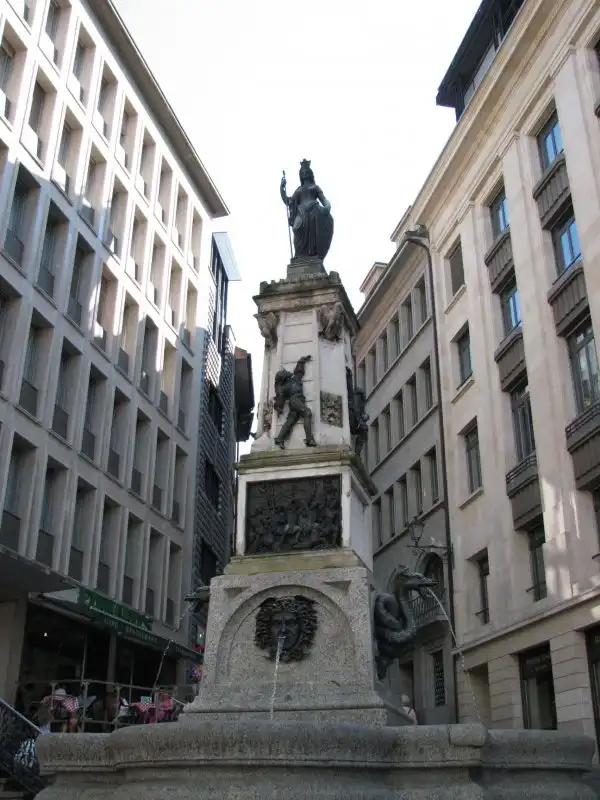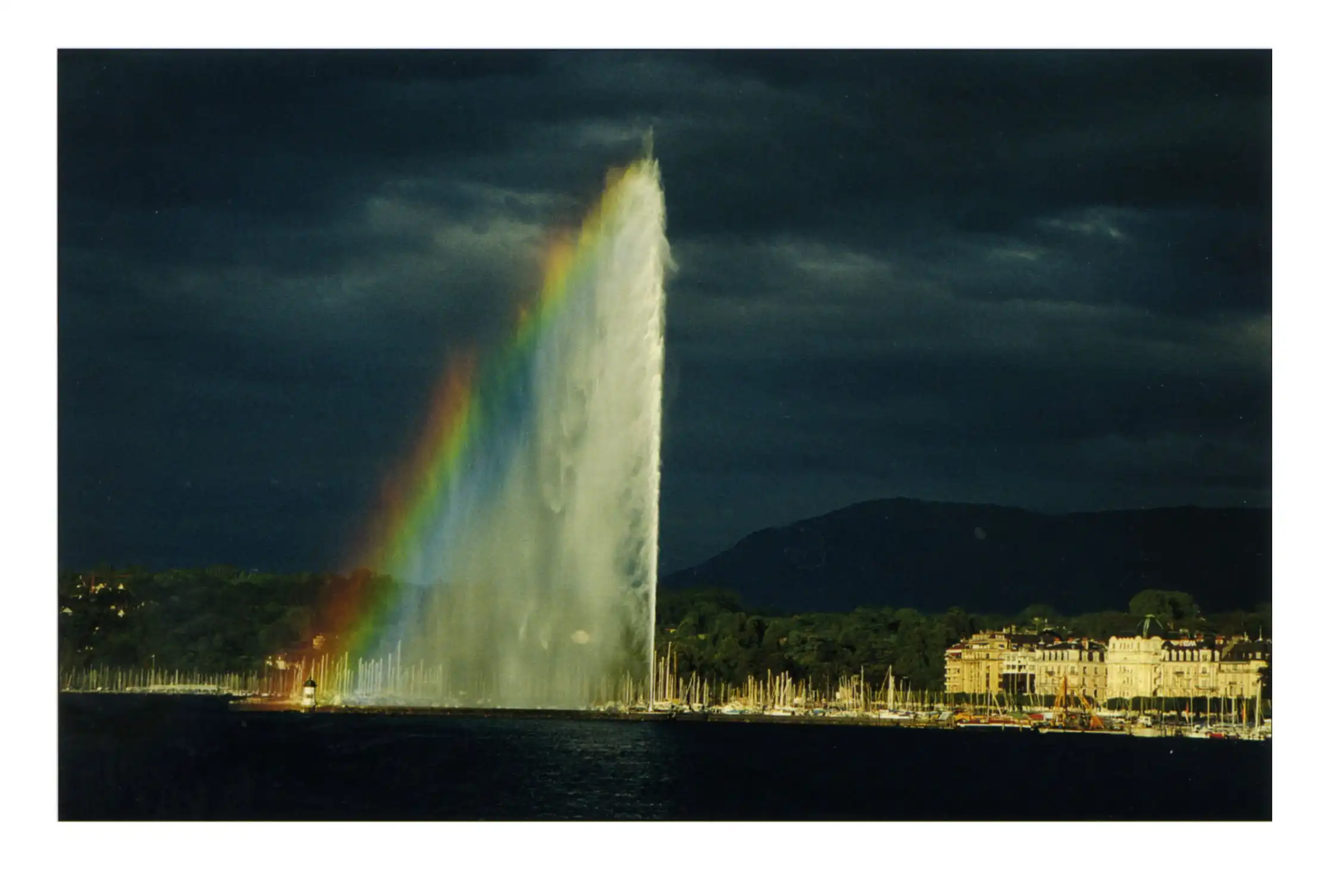 В самом центре Женевы из озера бьёт гигантский фонтан с радугой. Когда-то инженеры вывели слив водопровода в озеро, но немного не рассчитали с давлением, создаваемым мощными насосами и над озером забил многометровый фонтан с радугой в лучах вечернего солнца. Идея так понравилась жителям, что фонтан устроили специально постоянный… Внизу представлен ещё один знаменитый светомузыкальный фонтан в Английском парке.