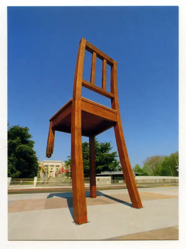 Прямо перед Дворцом Наций установлен памятник Европейскому Союзу “Сломанный стул”.