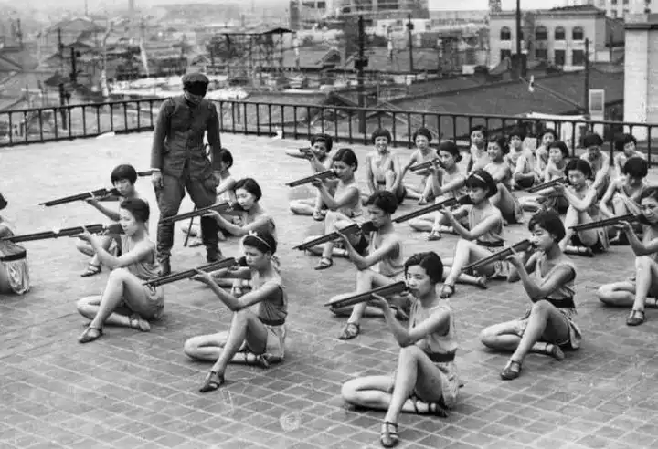Девушки на занятиях по военной подготовке на крыше дома в Осаке. Япония. 1937 год