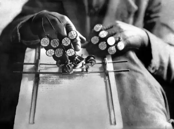 Австрийский изобретатель Алоис Гампер демонстрирует своё изобретение — машинописные перчатки для ведения бухгалтерского учёта, 16 февраля 1935 года