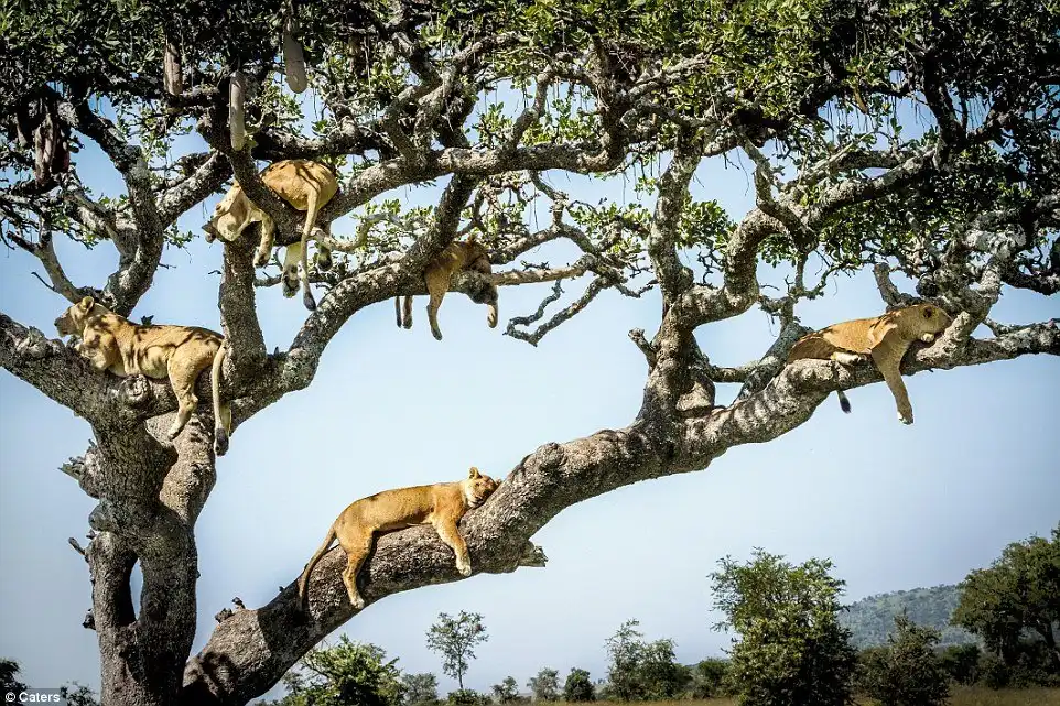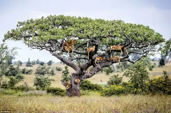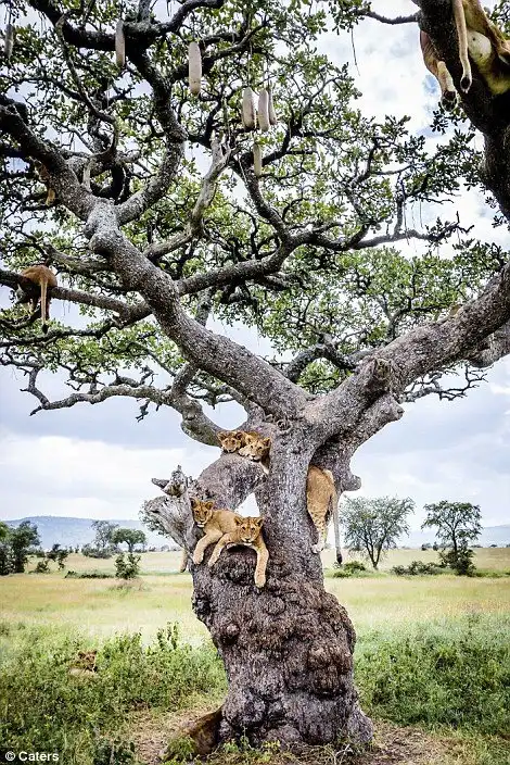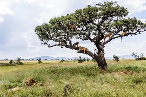 Австралийскому фотографу Бобби-Джо Клоу (Bobby-Jo Clow) во время сафари в Центральном Серенгети в Танзании удалось сделать невероятные снимки целой стаи львов: по крайней мере 15 хищников одновременно находились на дереве с разлогими ветвями высотой 4,5 метра.