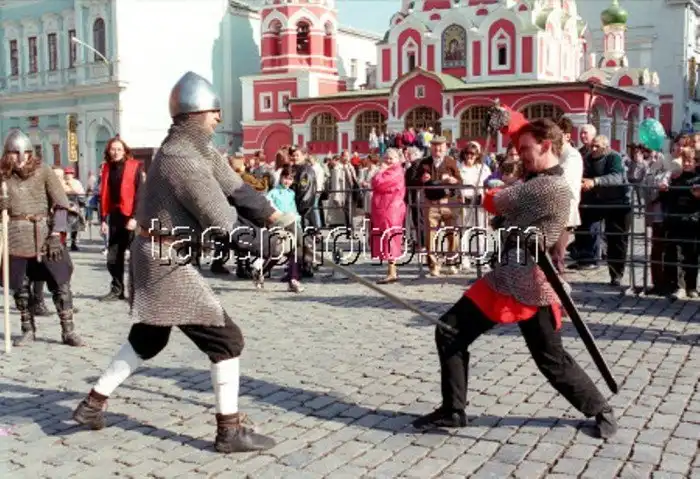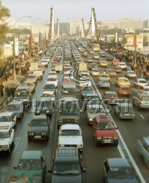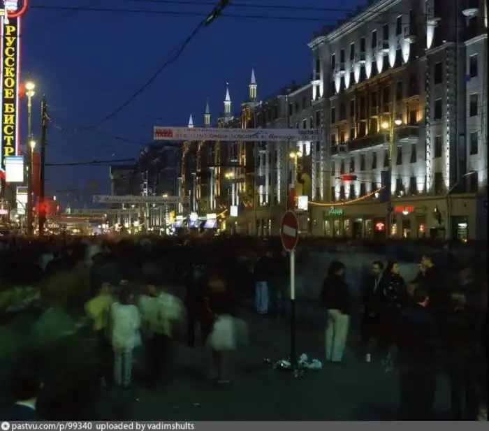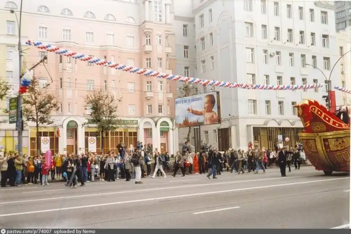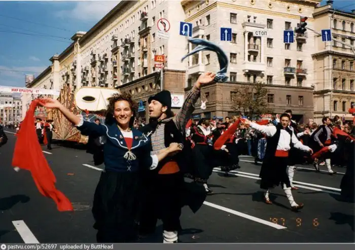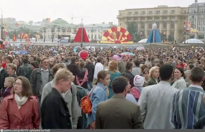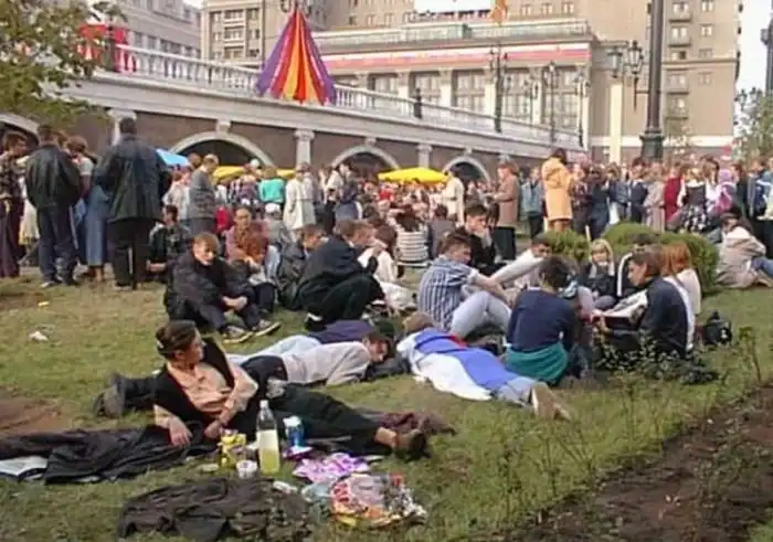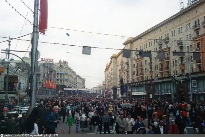 Кто в Москве не бывал, красоты не видал. Кстати, движение перекрыто, люди свободно ходят по улицам. Лужков в тот день запретил продавать все в стеклянной таре. И когда вечером народ сгоняли к метро, стоял сильный хруст от пластиковых стаканчиков под ногами.