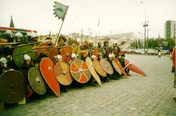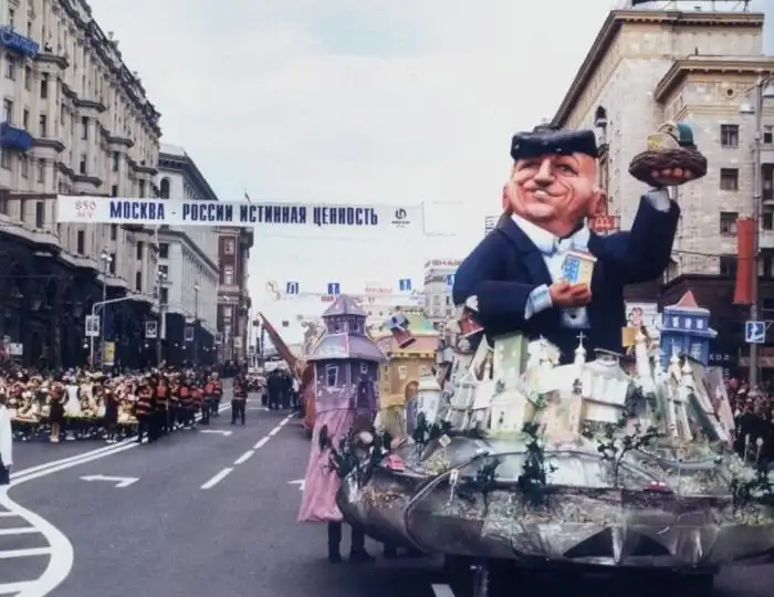 На ладье плывет сам Юрий Михайлович Лужков. А на плакате вдоль дороги красуется высказывание Вишневского – «Пусть я не мэр, но я обеспокоен». Кстати, людей, как видно здесь, за заборы ещё не загоняли.