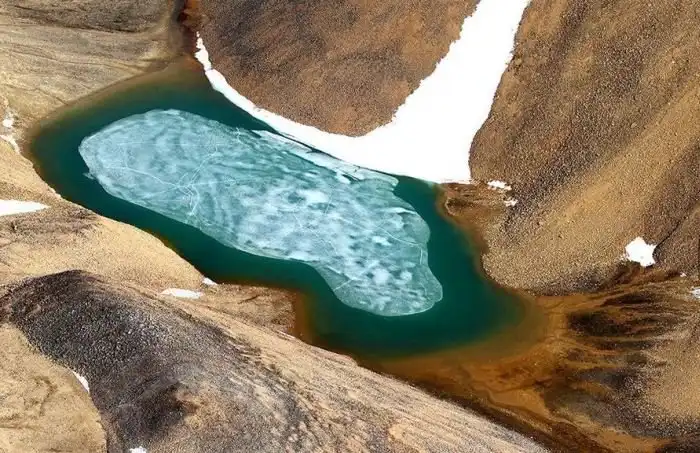 Каждое лето тающие ледники создают водоемы пресной воды на острове Баффинова Земля. Круглосуточный солнечный свет способствует появлению микроскопических водорослей, которые придают этим водоемам изумрудный оттенок.