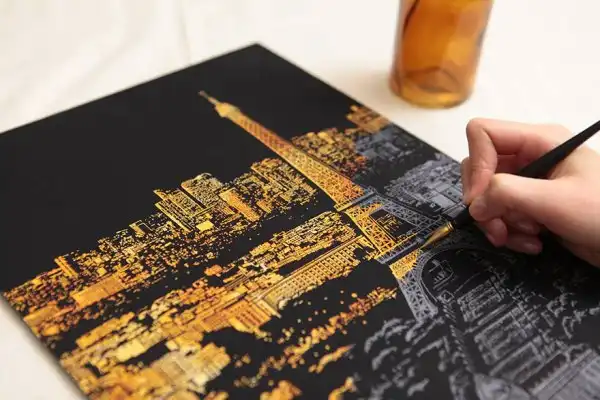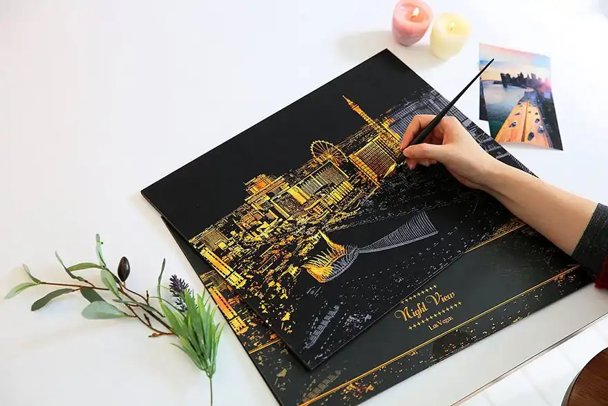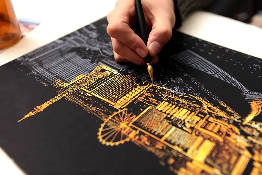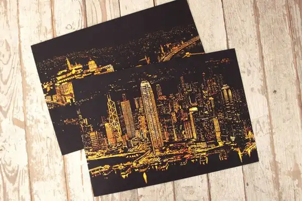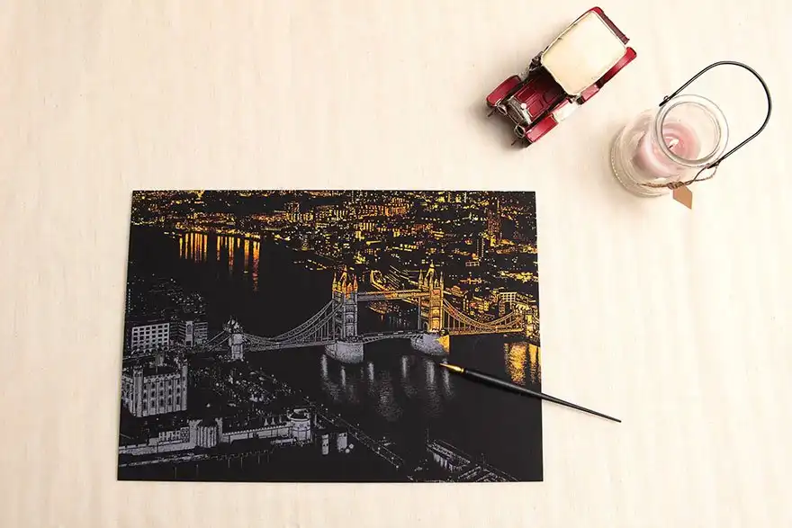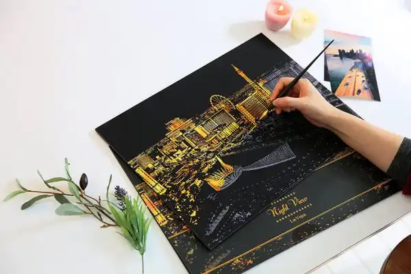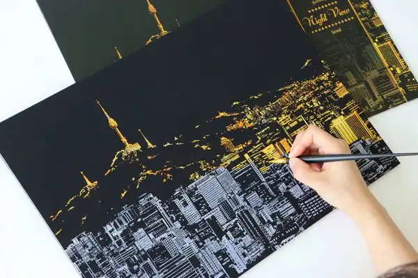 Дизайнеры разработали раскраску в стиле граттаж (царапание по воску острым инструментом), которая дает возможность «осветить» ночные городские пейзажи. Все, что нужно сделать, — это взять заостренную ручку-перо, процарапать специальные линии на картине, и в результате вам откроется потрясающая красота, спрятанная в темноте.