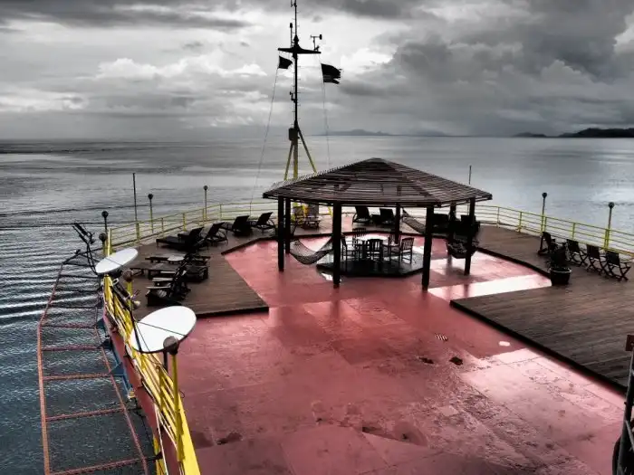 Под хостел переделали старую железную буровую платформу, стоящую прямо посреди моря, и на которой когда-то добывали нефть и газ.
