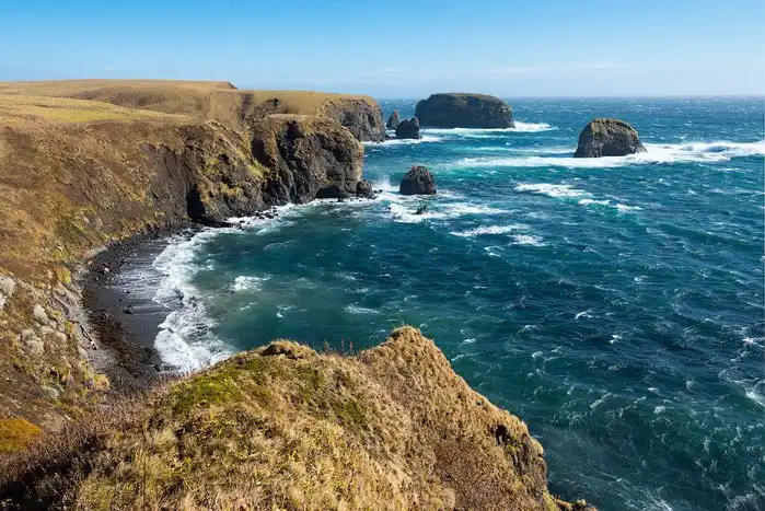 Остров Шикотан – это место край света. Всего в 10 км от поселка Малокурильское, за небольшим перевалом раскинулась его главная достопримечательность – мыс Край Света. Обрываясь в океан 40-метровыми скалами, мыс тянется от берега достаточно узким километровым языком и оставляет весьма сильное впечатление.