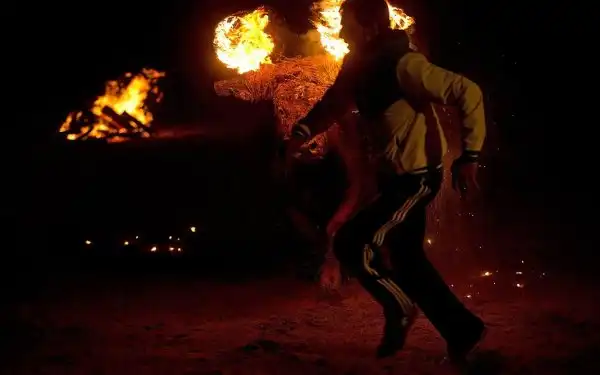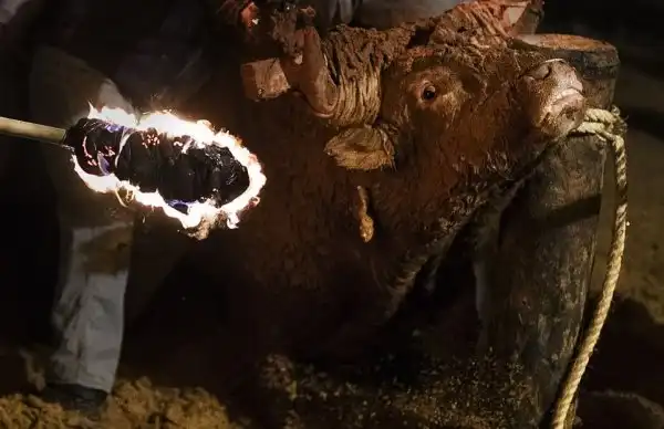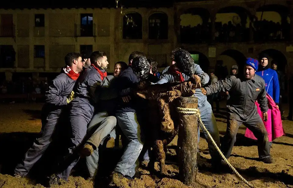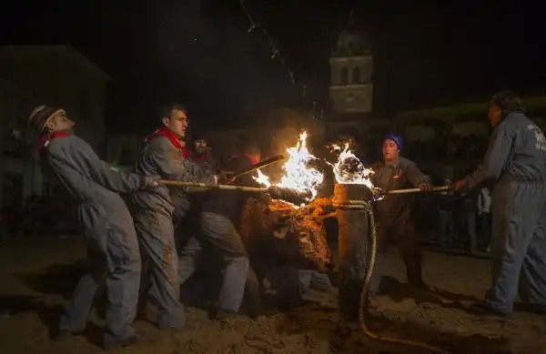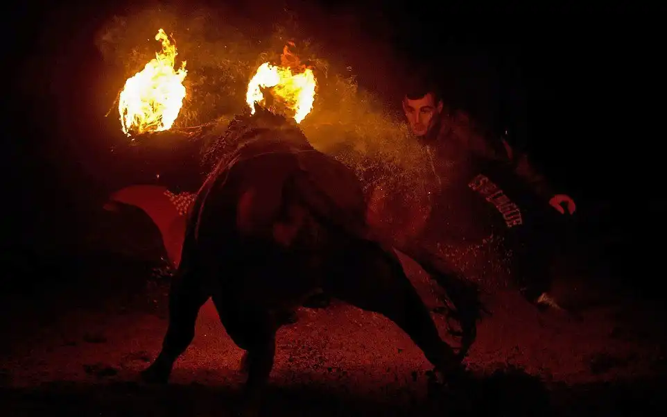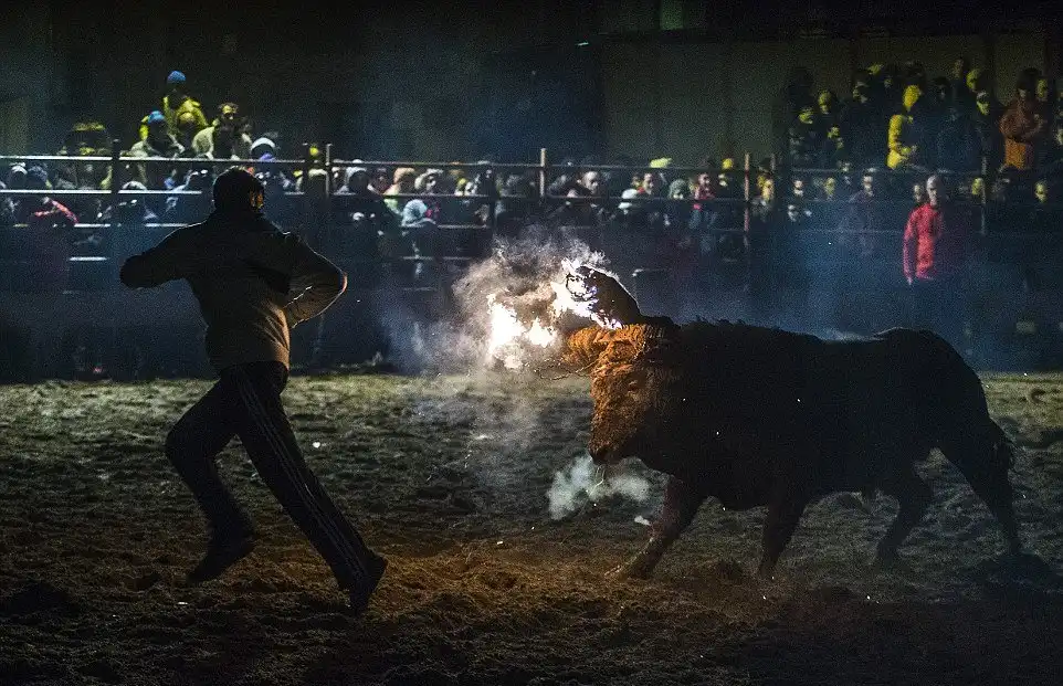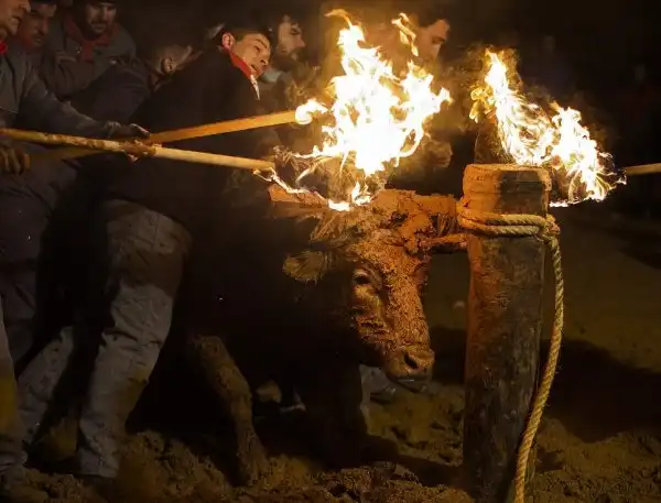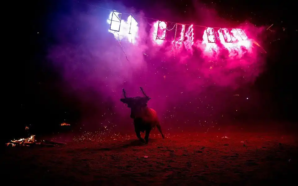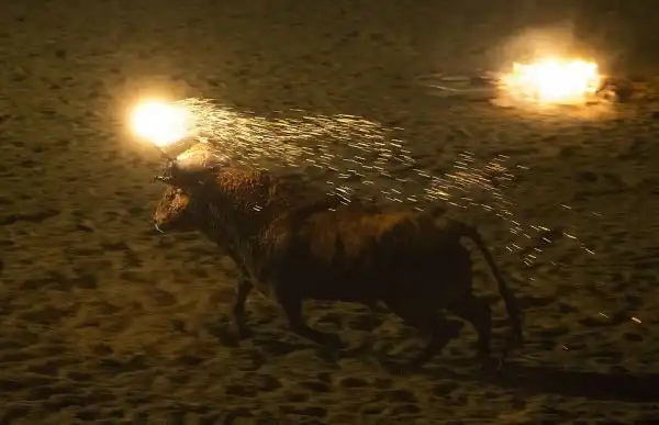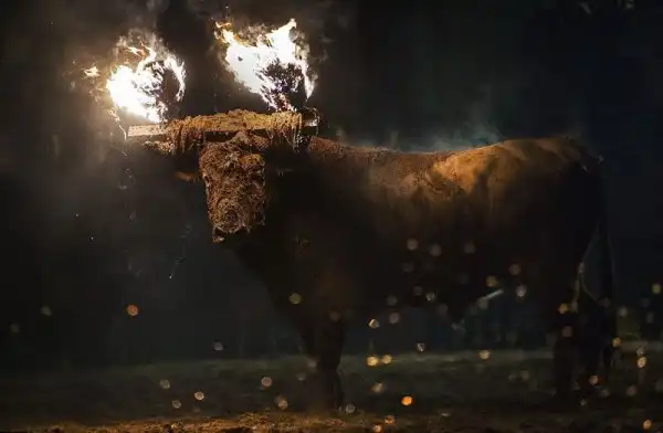 Это не какое-то апокалиптическое видение из средневекового фольклора, а испанский фестиваль, где живым быкам поджигают рога и выпускают на улицы деревни для развлечений. Каждый год в деревне Мадиначели в провинции Сория, на северо-востоке Мадрида, проходит древний фестиваль Торо Джубило, или Радость Быка, где участники обвязывают вокруг рогов молодых быков ремни, делая своеобразные факелы, которые обливаются горючей смесью и поджигаются. Горячие искры от факелов на животных летят во все стороны. Фыркая в демонической ярости, горящий бык несется по темным улицам городка, как будто он явился прямо из глубин ада. Власти испанских регионов Леона и Кастилии дали фестивалю специальный культурный статус.