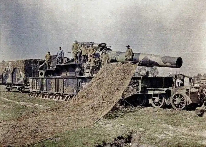 5 сентября 1917 года. Французские солдаты камуфлируют 370-миллиметровую железнодорожную пушку на западном фронте в Первой мировой войне