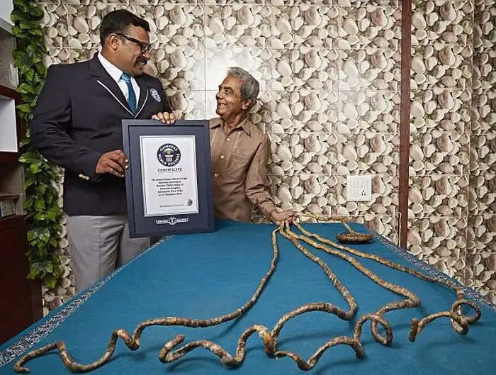 78-летний Шридхар Чиллал (Shridhar Chillal) вошел Книгу рекордов Гиннеса 2016, как человек с самыми длинными в мире ногтями. Пожилой мужчина перестал стричь ногти на левой руке в 1952 году в возрасте 16 лет. За это время ногти на его руке выросли до невероятных размеров - от 164,5 см до 200 см. В течение жизни Шридхар испытывал много трудностей из-за своих ногтей, он не мог устроить на работу и долгое время не мог жениться, однако, сейчас он говорит, что достиг своей цели. Теперь мужчина планирует состричь ногти и передать их в музей.