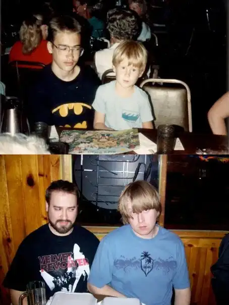 Семьи у всех разные. И детские фотографии у всех тоже разные. Кто-то ползал по ковру, как обычный ребенок, а кто-то играл в «человеческую многоножку». В любом случае, все эти фотографии одних и тех же людей были сделаны в разное время – на одном снимке вы видите главных героев детьми, на другом – уже взрослыми.