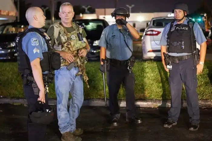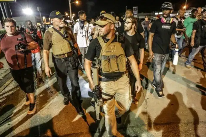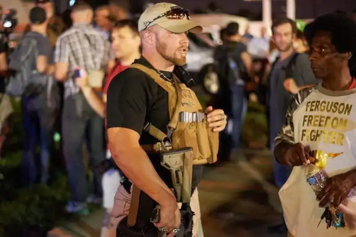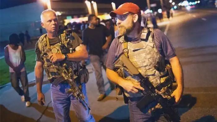 Суровые парни, которых вы видите на этих фото, являются членами крайне-правой организации Oath Keepers («Хранители Клятвы»), которая состоит в основном из бывших и действующих военных, полицейских и прочих представителей силовых структур. Ради своего кодекса эти люди готовы ослушаться приказов, идущих в разрез с Конституцией США. В 2009 году Oath Keepers был основан Стюартом Родосом, бывшим десантником и выпускником Йельского университета, сейчас в рядах этой организации насчитывается порядка 30 000 человек. Членов Oath Keepers часто можно встретить на различных акциях протеста, они всегда хорошо вооружены и экипированы. Во время беспорядков в Фергюсоне эти парни обеспечивали безопасность сотрудников СМИ и предотвращали случаи мародерства.
