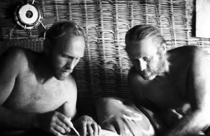 Юрий Сенкевич и Тур Хейердал во время путешествия на папирусной лодке "Ра", 1969 год