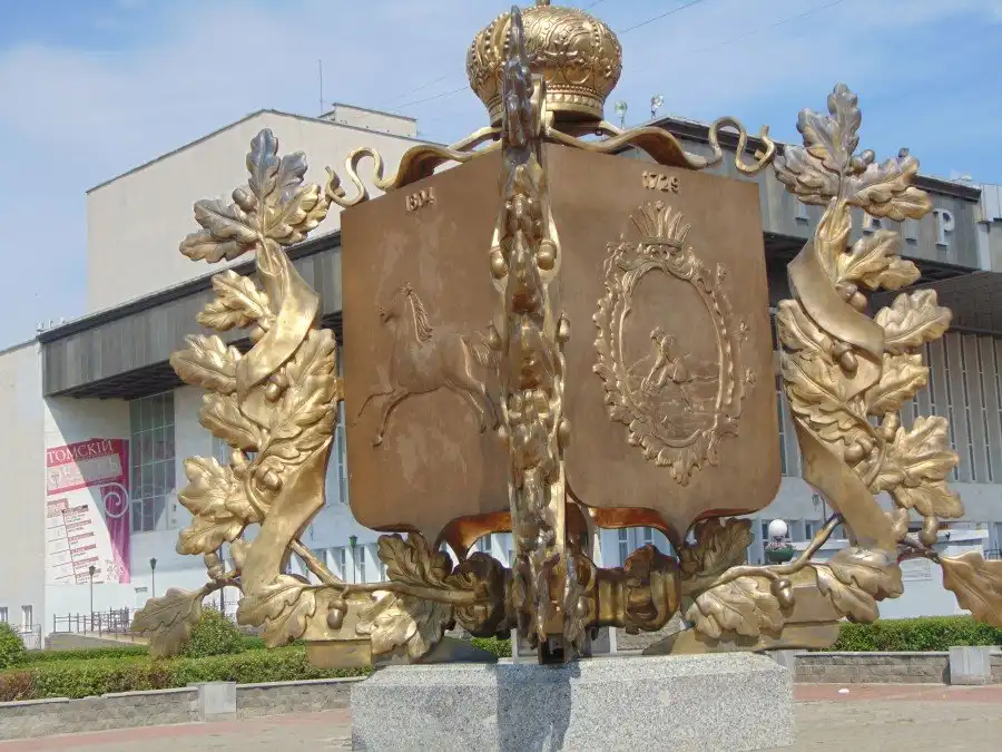 22. На площади установлен памятник "400 - летие Томска", состоящий из 5 объектов. Один из них установлен в самом центре и на нем вылита история герба Томска. С каждой стороны нарисован герб, и подписан год, в котором действовал этот герб.
