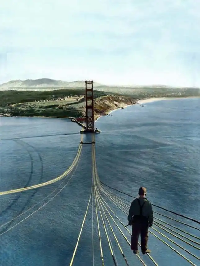 Рабочий, стоящий на недостроенном мосту "Золотые Ворота", Сан-Франциско, 1935 год