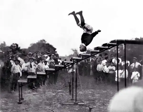 Американский циркач Александр Пэтти спрыгивает по ступенькам вниз головой во время выполнения трюка, 1908 год