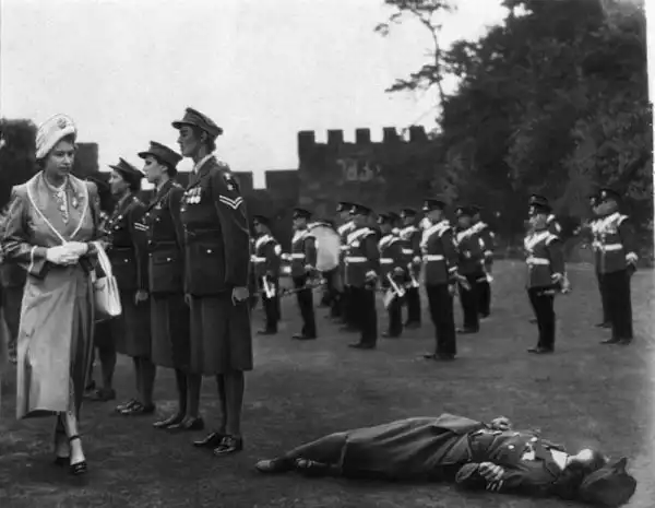 16. Принцесса Елизавета смотрит на военнослужащую, которая упала в обморок на церемонии, 1949 год.
