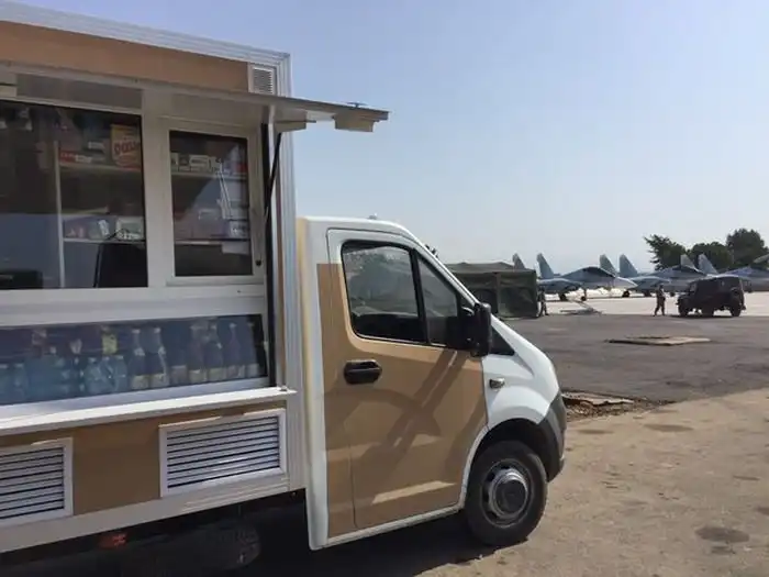 Передвижной киоск с российскими продуктами питания на авиабазе в Сирии