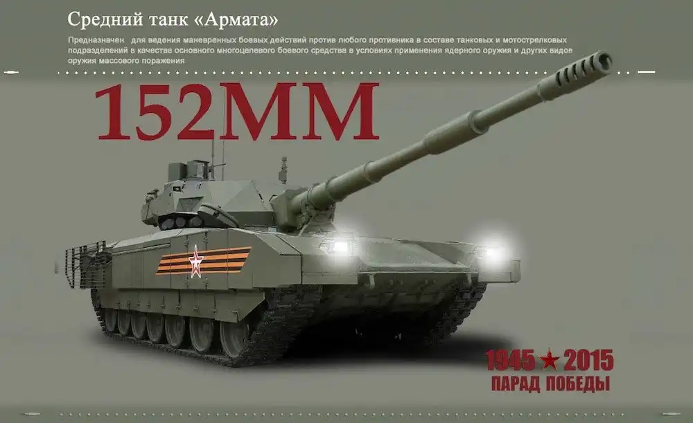 Впервые мир увидел Т-14 «Армата» в этом году, во время парада, посвященного Празднику Победы. Танк оснащен новейшей 152-мм пушкой 2А83, которая успешно прошла испытания в том числе и с новыми снарядами, которые способны прожигать стальную броню толщиной больше метра. На сегодняшний день самым большим калибром пушки, устанавливаемых на танки является 125 мм, а общепринятым — 120 мм.