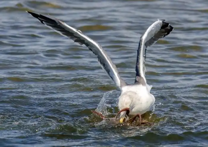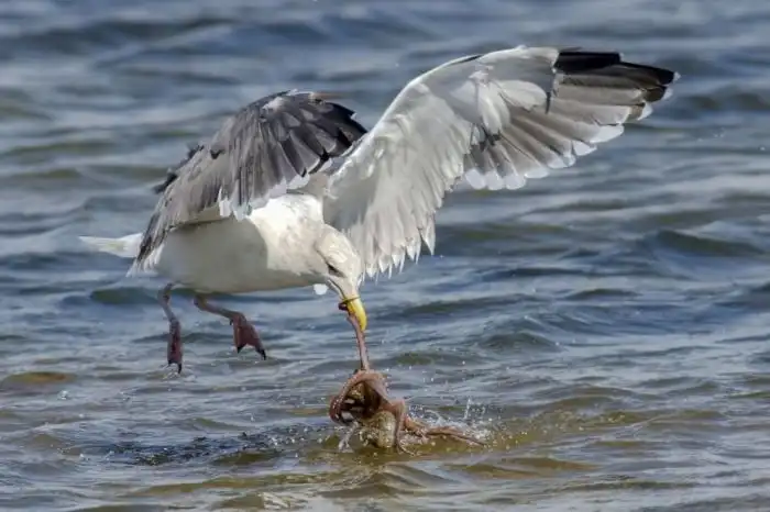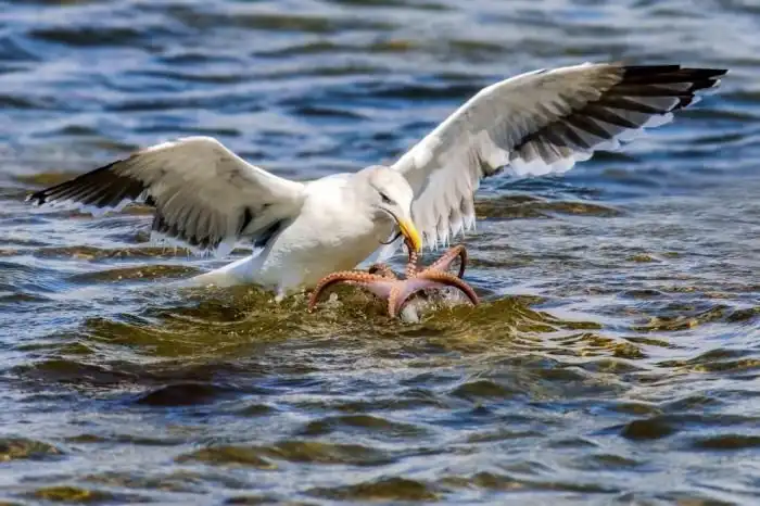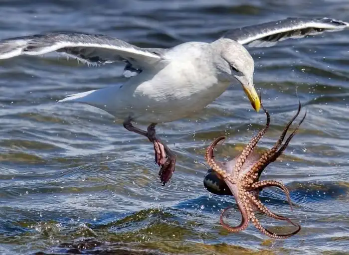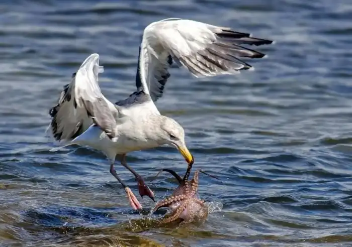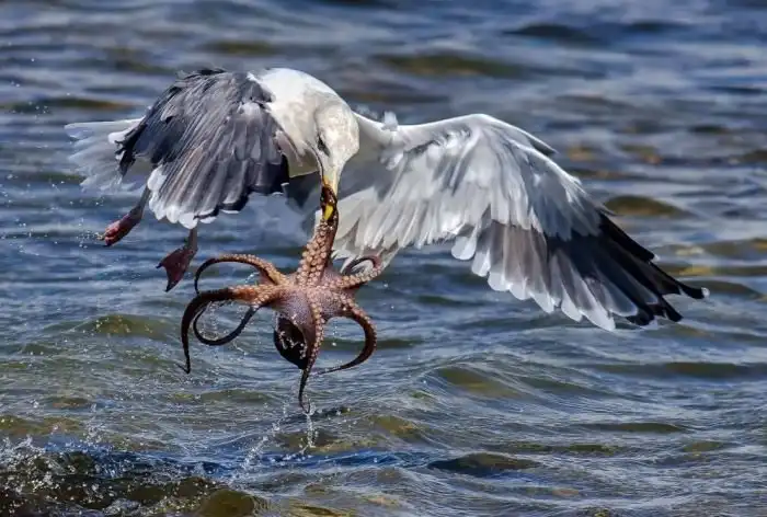 Прогуливаясь по калифорнийскому пляжу Bolsa Chica, фотограф-любитель по имени Эндрю стал невольным свидетелем драматической борьбы осьминога и чайки. Заметив осьминога, чайка решила его выловить, однако, тот начал активно сопротивляться. Несмотря на сопротивления беспозвоночного, более крупной птице все же удалось вытащить бедолагу из воды, после чего она приземлилась на берег и отобедала им.