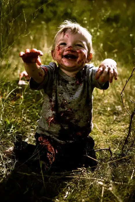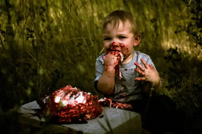Одни поклонники фильмов о зомби настолько увлеклись данной темой, что решили воплотить ее в праздничной фотосесси своего маленького сына. Они заказали торт в форме мозга, а все остальное, что требовалось для получения подобных снимков, ребенок сделал сам.
