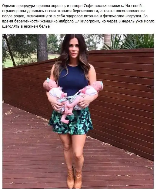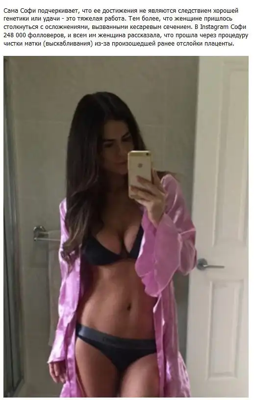 Увлекающаяся фитнесом и ведущая здоровый образ жизни австралийка Софи Гуидолин шокировала пользователей сети тем, как быстро она сумела прийти в форму после родов. Через 8 недель после появления на свет двух близняшек молодая мать уже вновь могла похвастаться подтянутым телом и плоским животом.