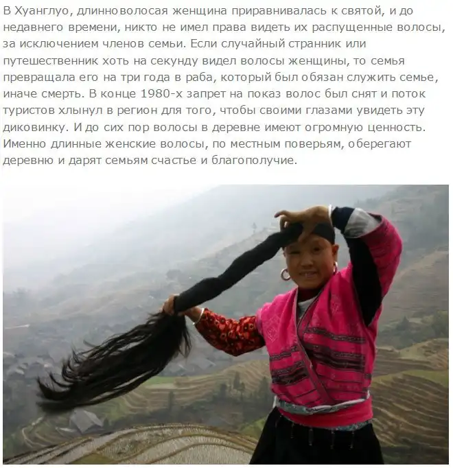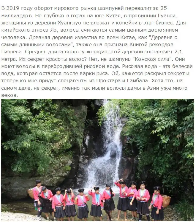 В Китае есть небольшая деревня, где все женщины и девушки могут похвастаться самыми длинными волосами в мире. Местным жительницам запрещено стричь волосы, а сами они знают секрет идеальных волос.