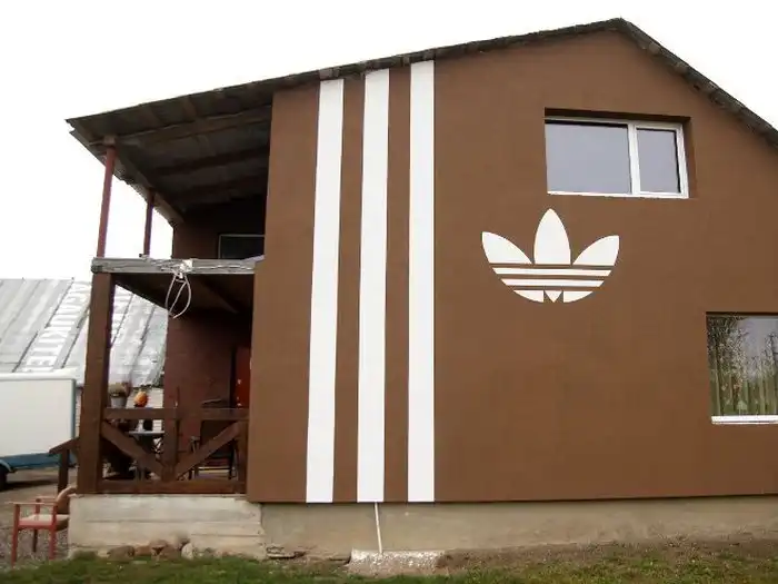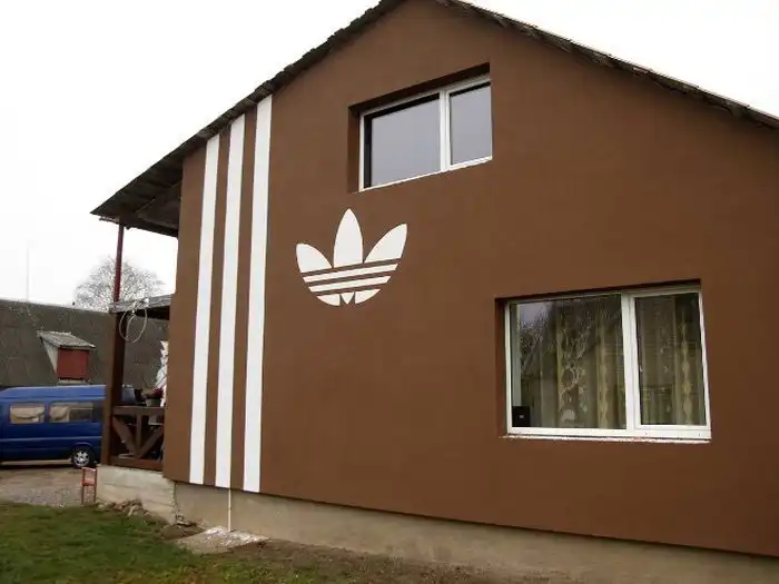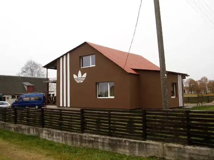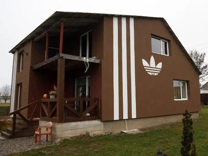 Смею предположить что дизайн этого дома понравился бы вчерашнему парню, который посетил Европу и устроил прикольную фотосессию в образе гопника. Этот домик принадлежит одному жителю Литвы, который всю свою жизнь носит спортивные костюмы и другую продукцию известного всем производителя спортивной одежды. Свою признательность немецкому бренду благодарный клиент решил выразить столь необычным способом.