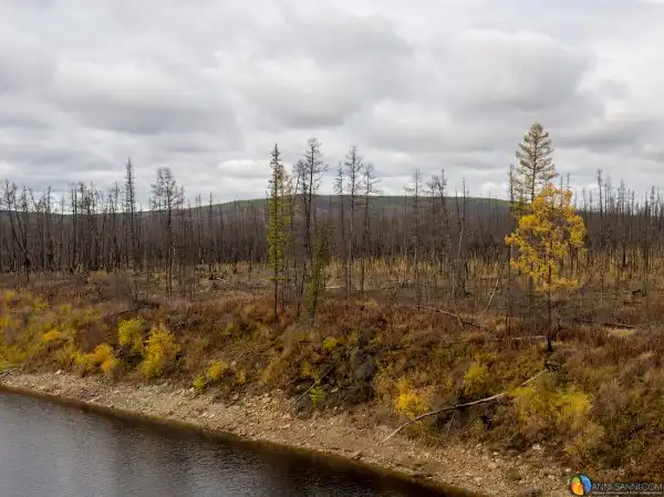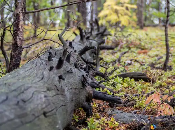 А вот уже "не-красоты природы" - так выглядит выгоревший лес, спустя несколько лет после пожара, когда почва и мелкие растения уже восстановились, но деревья остались теми же обгорелыми остовами.