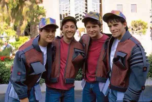 Майкл Джей Фокс со своими дублёрами на съёмках фильма "Назад в будущее 2", 1989 год