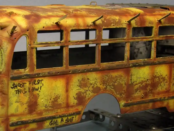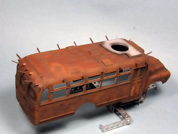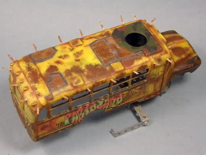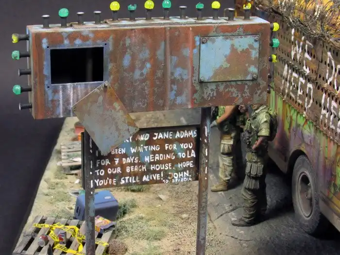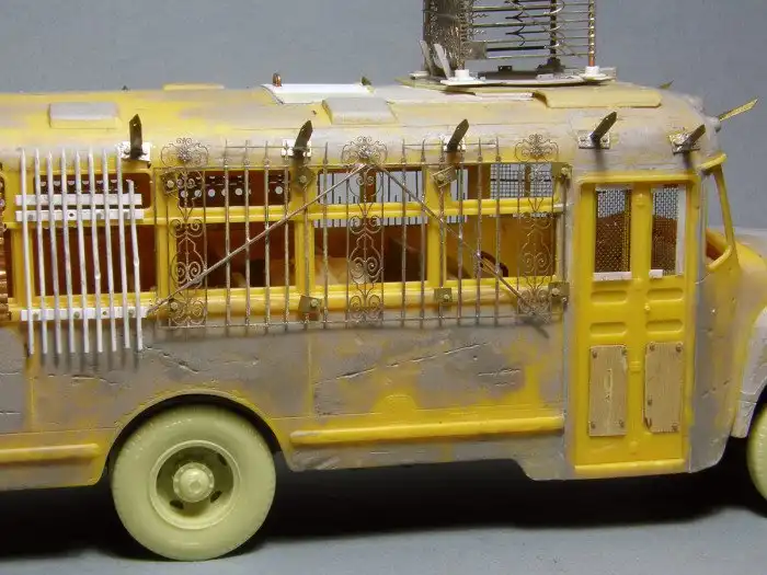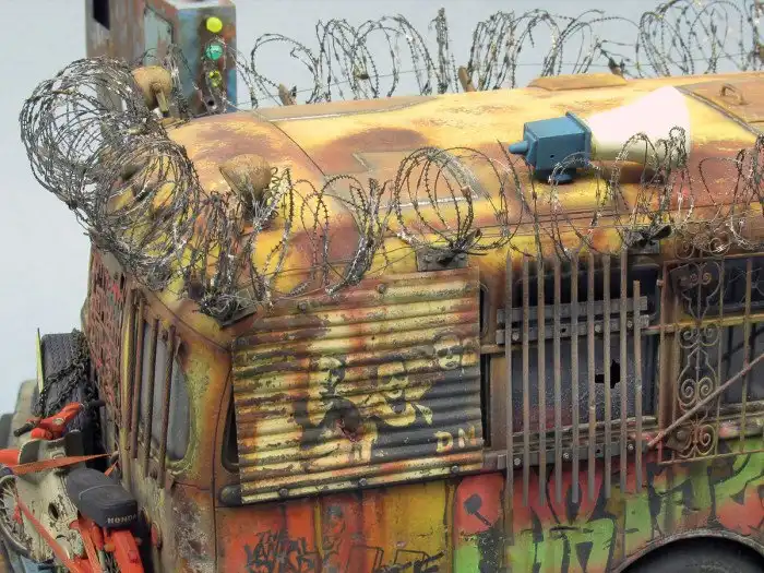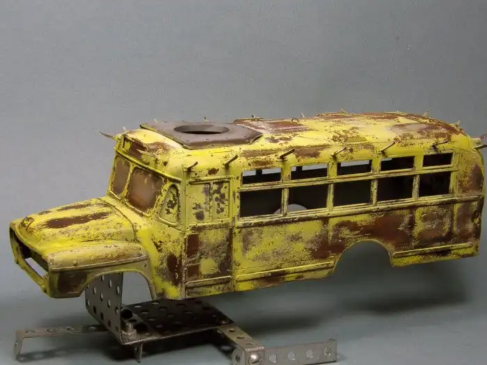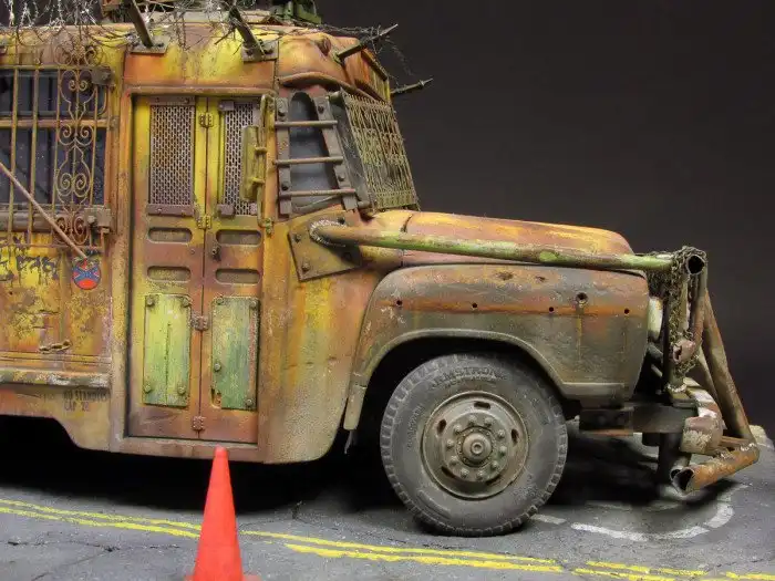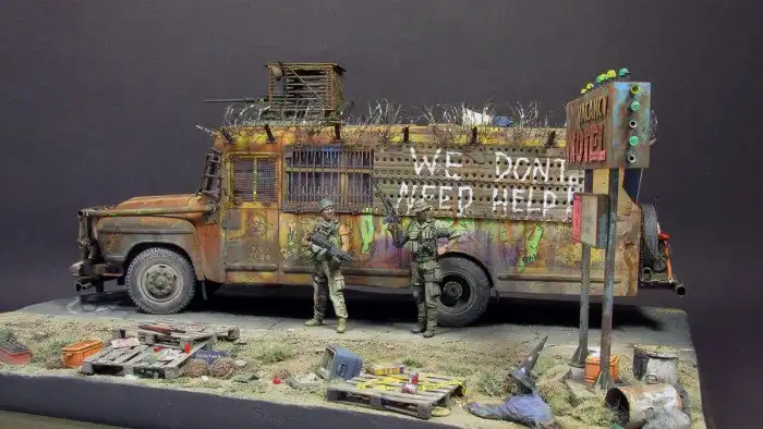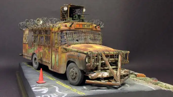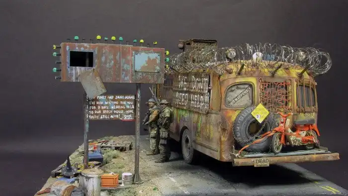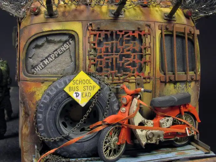 Большинство диорам, которые мы вам показывали, были посвящены Второй мировой войне, однако, сегодняшняя диорама посвящена зомби-апокалипсису и изображает зомби-автобус. Как собиралась эта диорама смотрим далее.