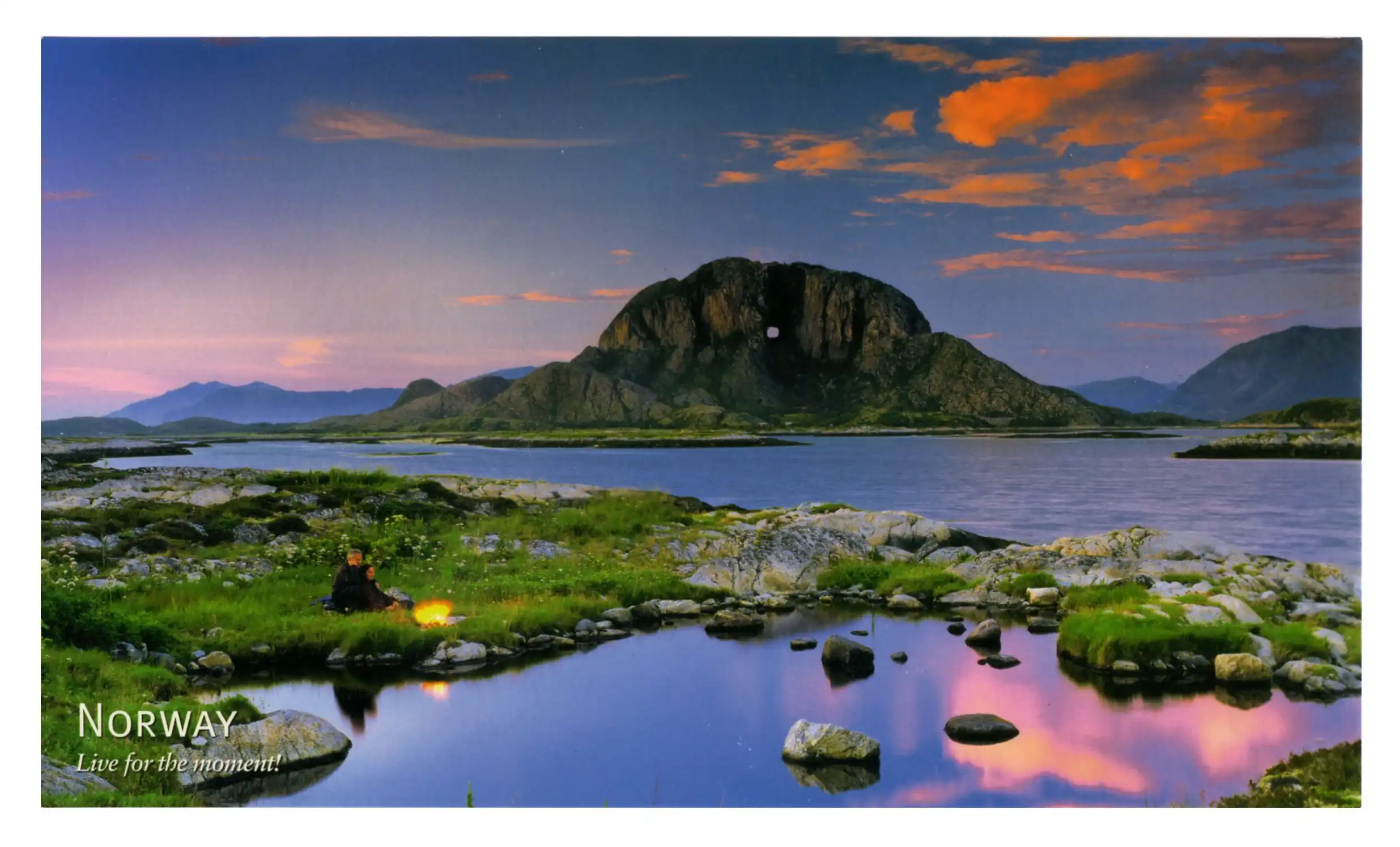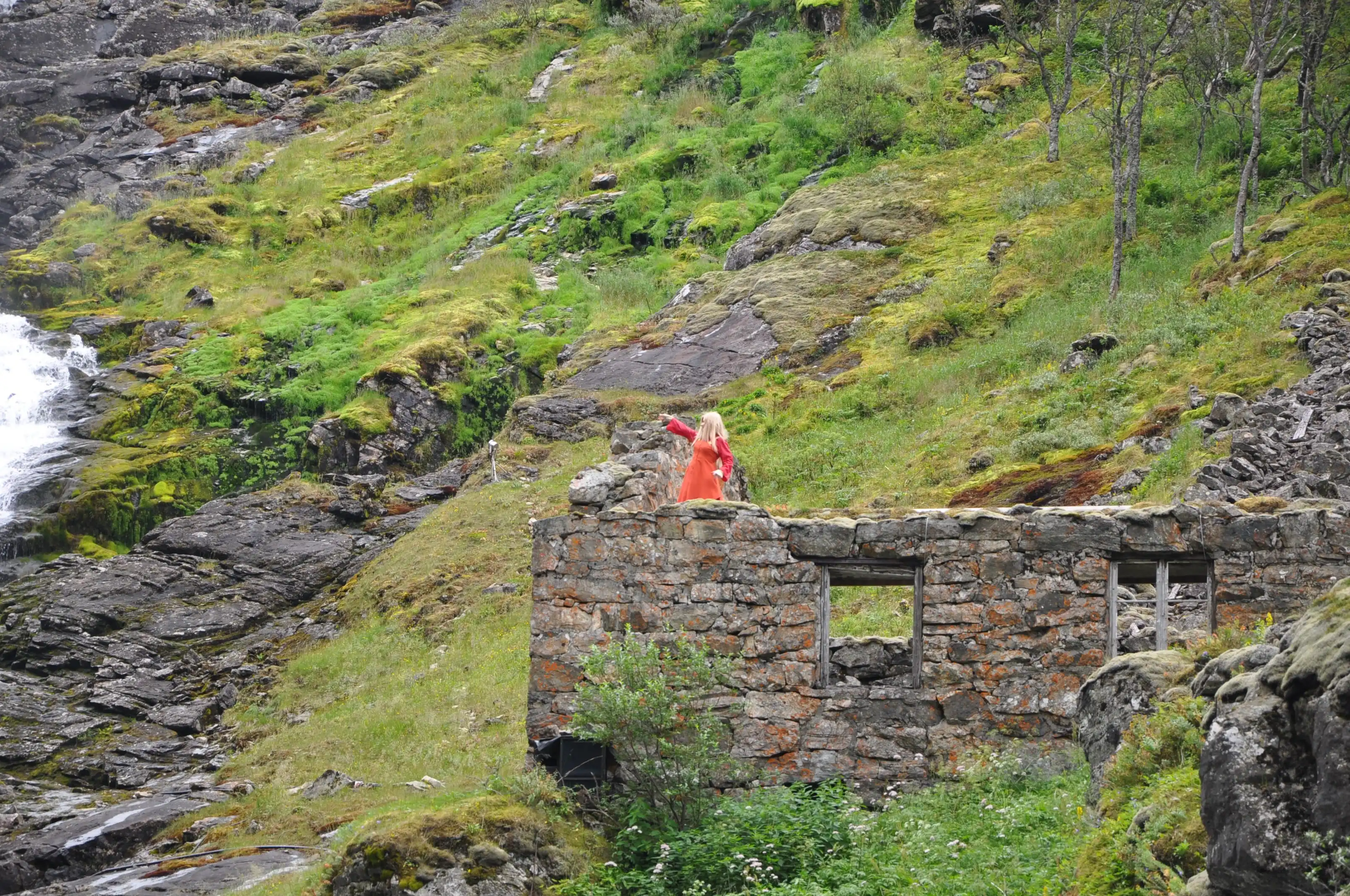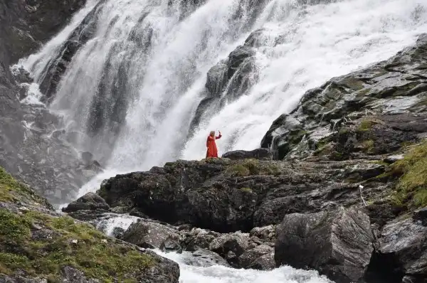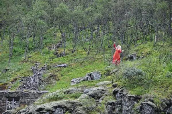 Если приглядеться, у подножия можно увидеть девушку в оранжевом платье, заманивающих путников… Как-то она связана со скандинавским фольклором про духов гор и троллей…