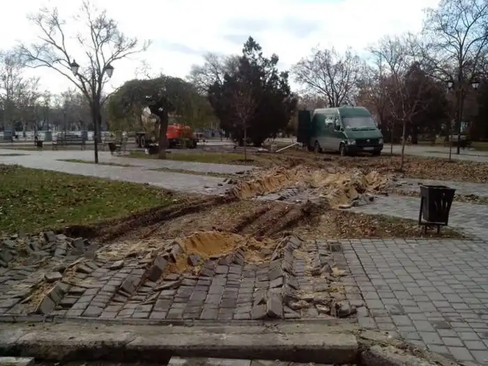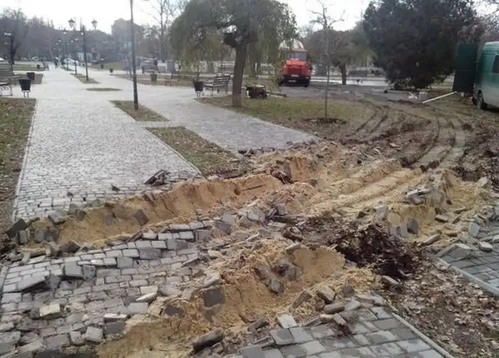 В центре Николаева в Пролетарском сквере, который нынче называют «Сердцем города», бетономешалка повредила плитку, уложенную на пешеходных дорожках. Для чего грузовику понадобилось ехать по плитке, не известно. Теперь дорожки придется восстанавливать, кроме того в восстановлении нуждается и газон.