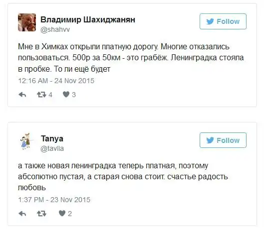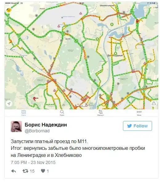 23 ноября первой участок новой трассы M11 Москва - Санкт-Петербург стал платным. Платить теперь придется за проезд с 15-го по 58-й километр трассы. С самого утра на подъезде к Москве образовались пробки. Автомобилисты жаловались на слишком дорогую стоимость проезда и на то, что платная дорога не соответствует всем необходимым требованиям. Заторы в основном образовались у пунктов оплаты, некоторым пришлось прождать в очередях около часа. Периодически шлагбаумы поднимали и пропускали часть машин бесплатно. На подъезде к аэропорту Шереметьево люди были вынуждены выходить из общественного транспорта и идти пешком, чтобы успеть на рейс.
