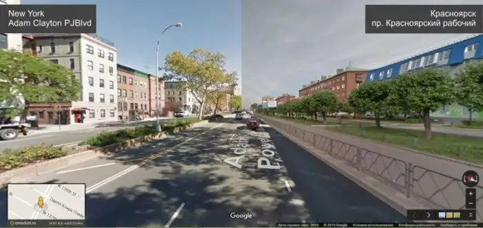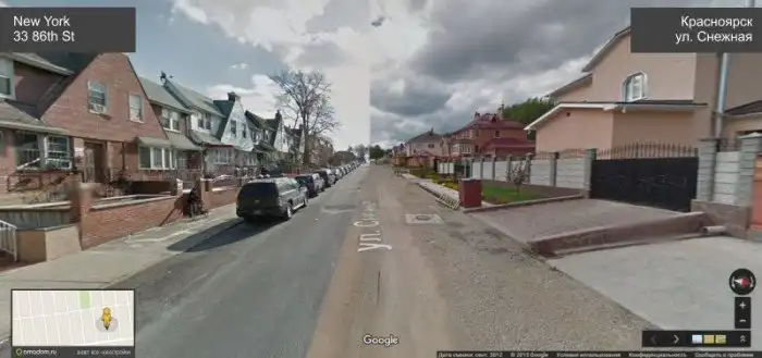 Красноярск и Нью-Йорк расположены в 9000 километрах и 11 часовых поясах друг от друга и являются совершенно разными городами, но один отечественный портал недвижимости сумел разглядеть в них сходство при помощи панорам Google Street View. Сравнив отдельные улицы обоих городов, авторы проекта пришли к выводу, что они обладают схожей архитектурой, и продемонстрировать это они решили при помощи склеенных фрагментов некоторых улиц.