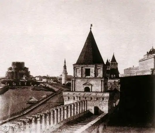 Старейшее известное фото Москвы. Представляет собой раскрашенный и отретушированный дагеротип Леребура, сделанный в 1842 г. На фотографии виден начальный этап строительства Большого кремлевского дворца. 1842 год.